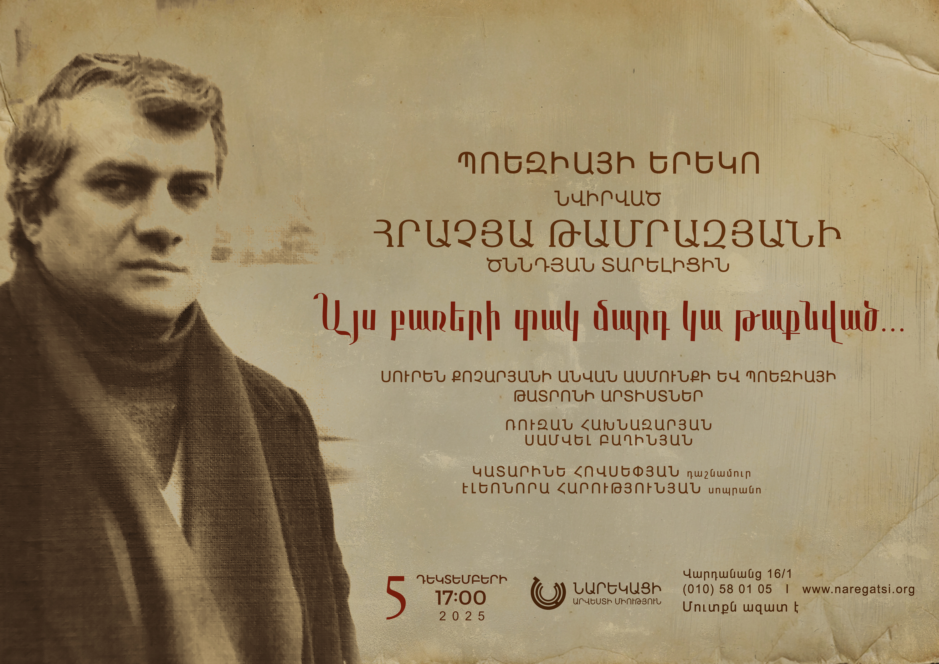 ՎԱՐԴԱՆ ԳՐԻԳՈՐՅԱՆԻՆ ՆՎԻՐՎԱԾ ՀՈՒՇ–ՑԵՐԵԿՈՒՅԹ Նոյեմբերի 21-ին Հայաստանի գրողների միության կլոր սրահում տեղի ունեցավ հայ վաղամեռիկ գրող Վարդան Գրիգորյանի ծննդյան 75-ամյակին նվիրված հուշ-ցերեկույթ: Վարդան Գրիգորյանն իր կարճ կյանքի ընթացքում իր երեք պատմավեպերով («Հավերժական վերադարձ», «Դար կորստյան», «Մանյա այրք») հասցրեց նոր շունչ հաղորդել ոչ միայն մեր ժամանակակից գրականությանը, այլև Րաֆֆուց, Ծերենցից, Մուրացանից, Դեմիրճյանից հետո ստեղծեց պատմավեպի մի […]